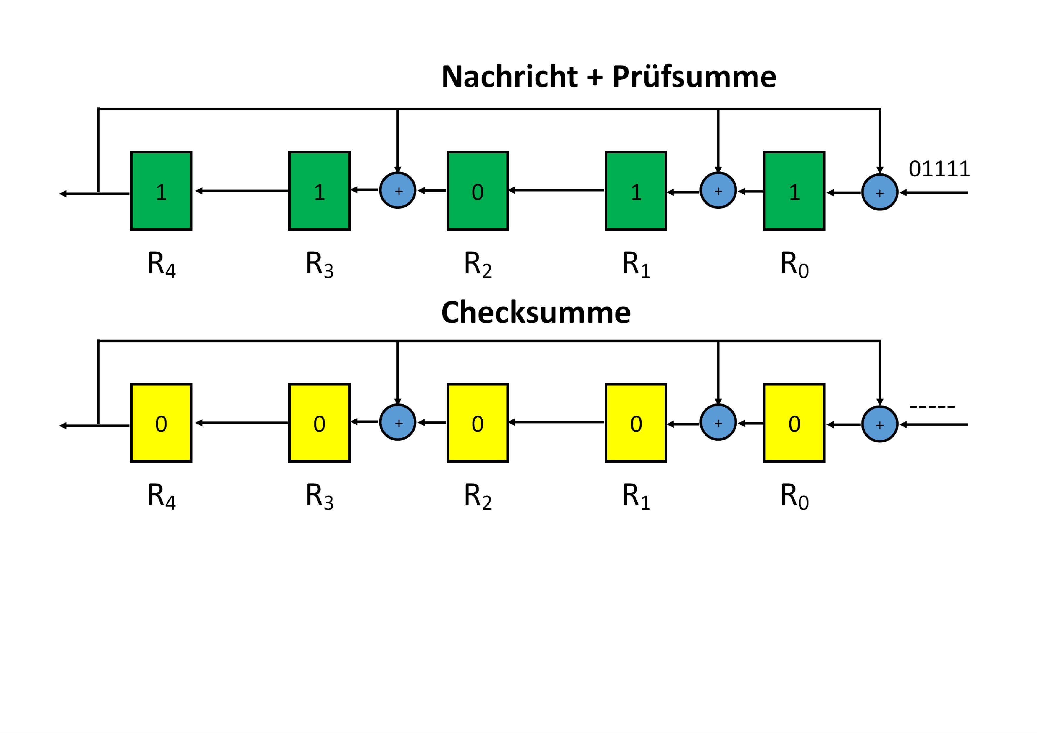 versendet, wird mithilfe der CRC-Schieberegisterstruktur eine Prüfsumme erstellt.